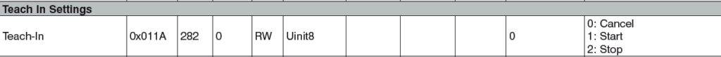 3. setați parametrul „Teach-in” la „Start” (index: 282, date: 01)